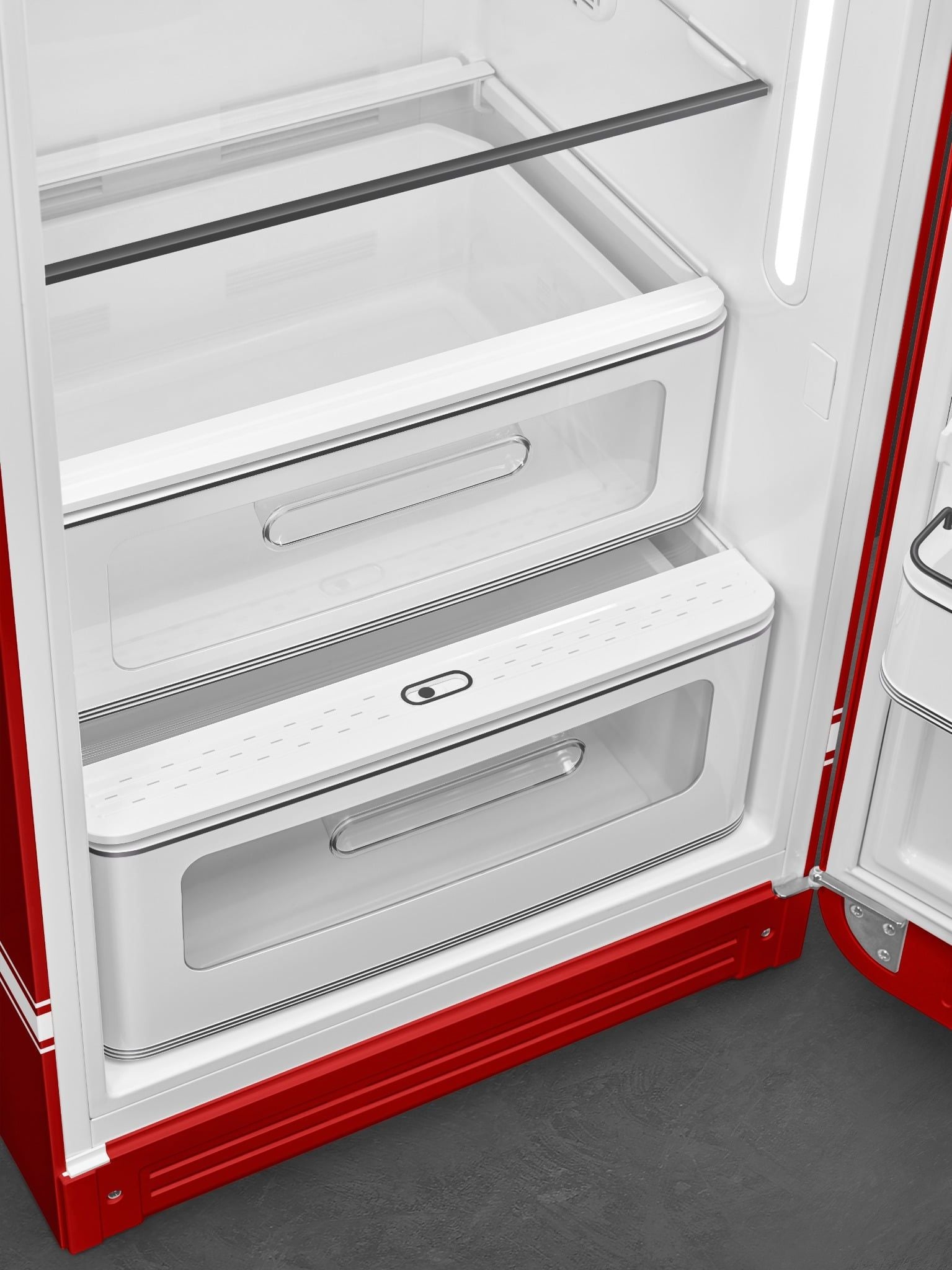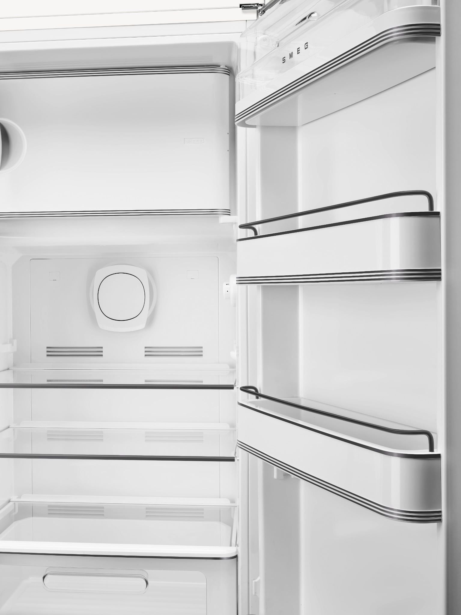Tay nắm, lấy cảm hứng từ Porsche 911, được cân chỉnh tỷ lệ tinh tế theo kích thước tổng thể của tủ để tạo nên một thiết kế hài hòa, trong khi logo Smeg đen mờ góp thêm cá tính cho diện mạo chung.